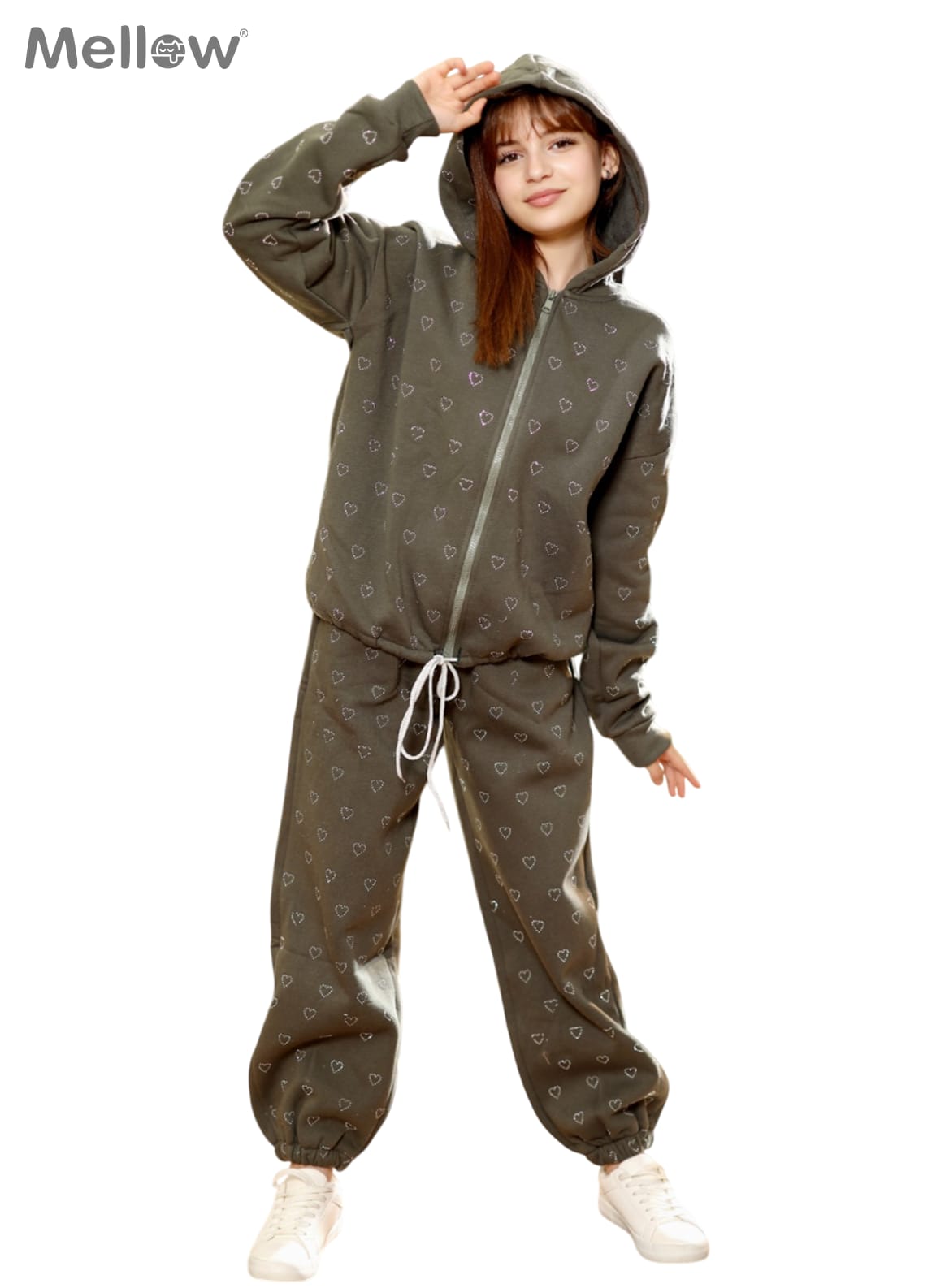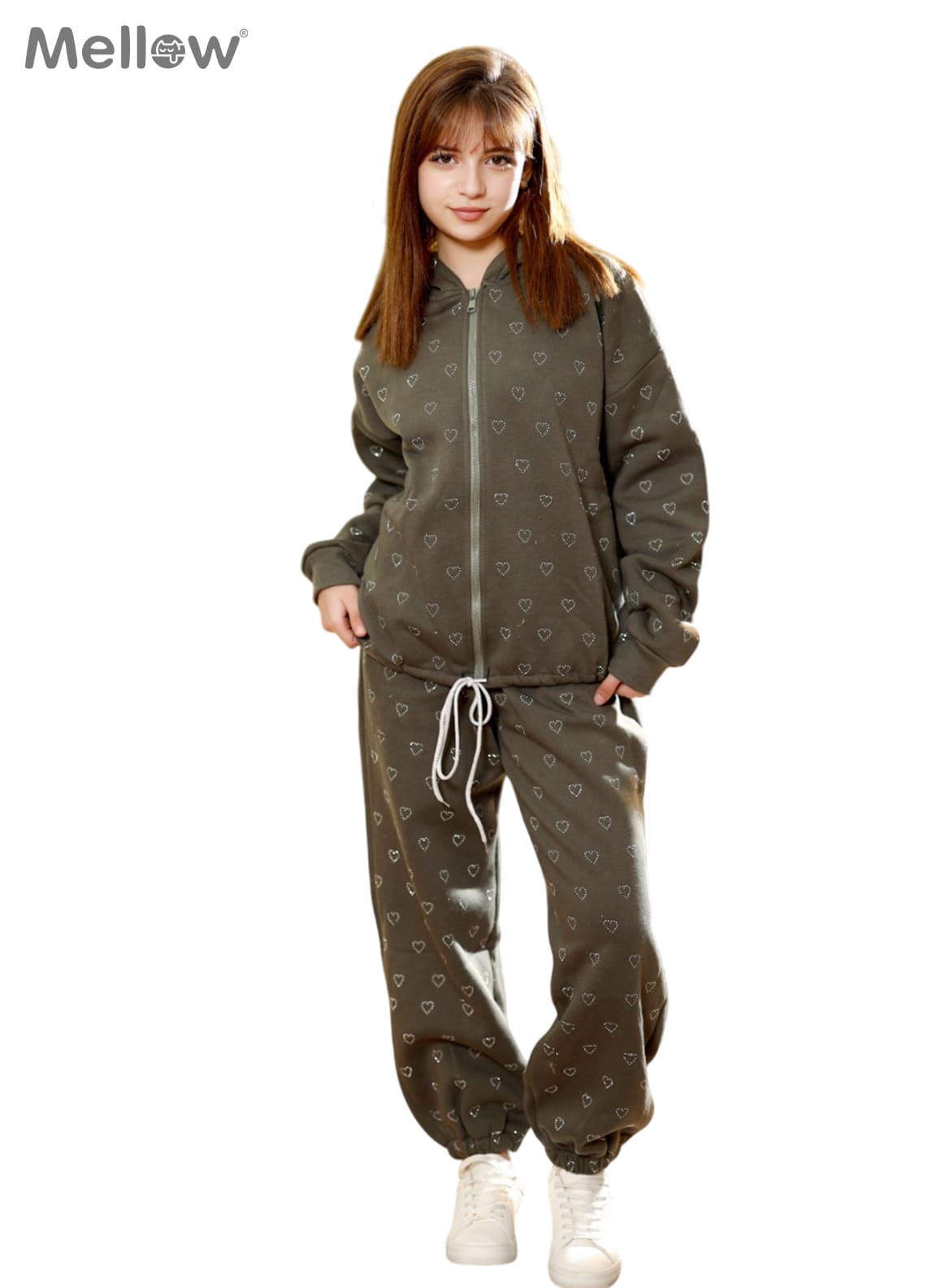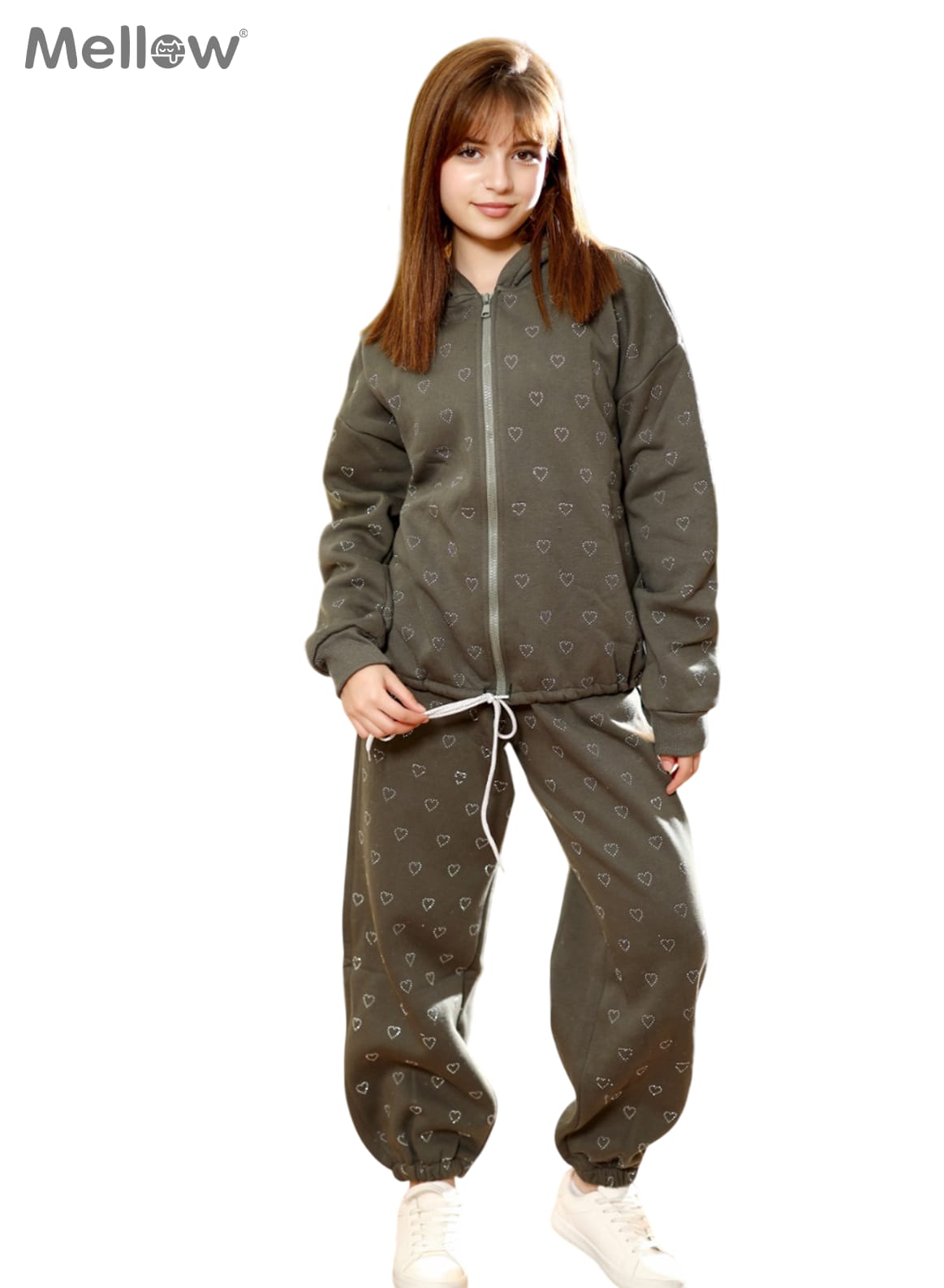 سوت أنيق بلون زيتي بنقوش قلوب صغيرة تضيف لمسة حب طفولية ساحرة.