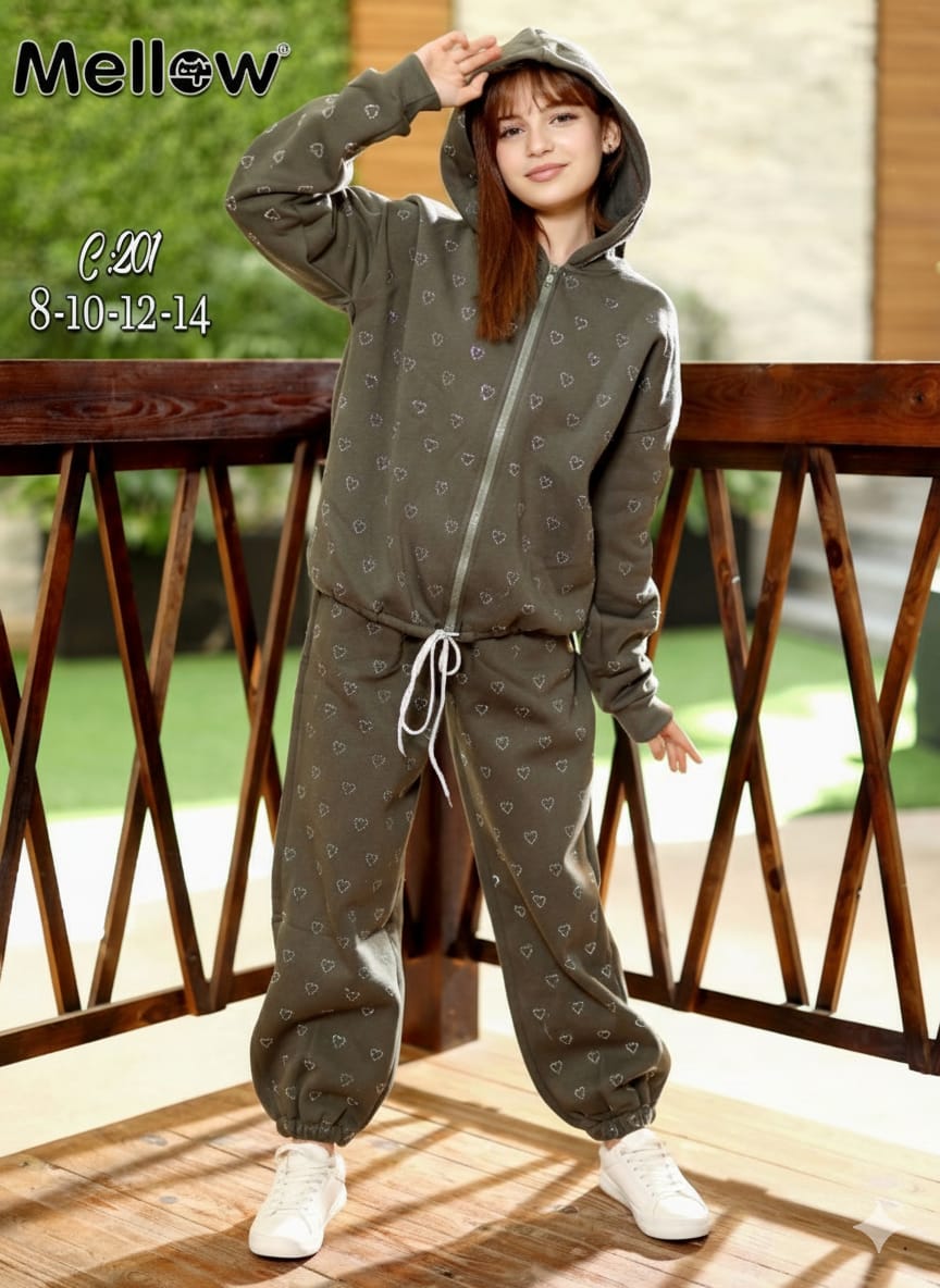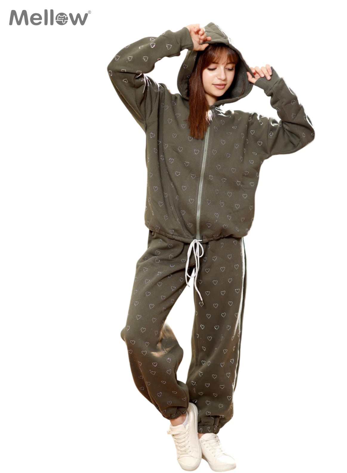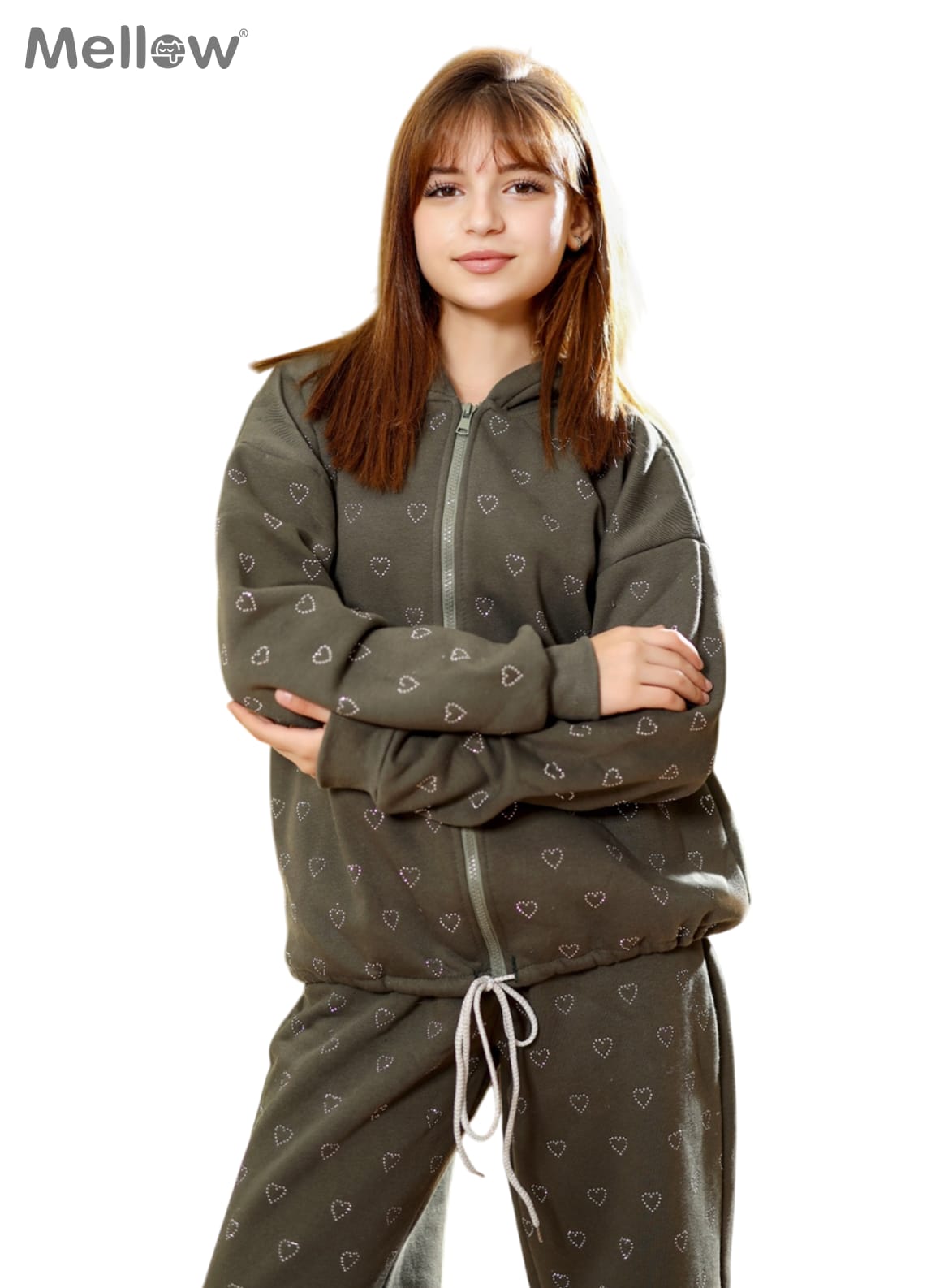 سوت أنيق بلون زيتي بنقوش قلوب صغيرة تضيف لمسة حب طفولية ساحرة.