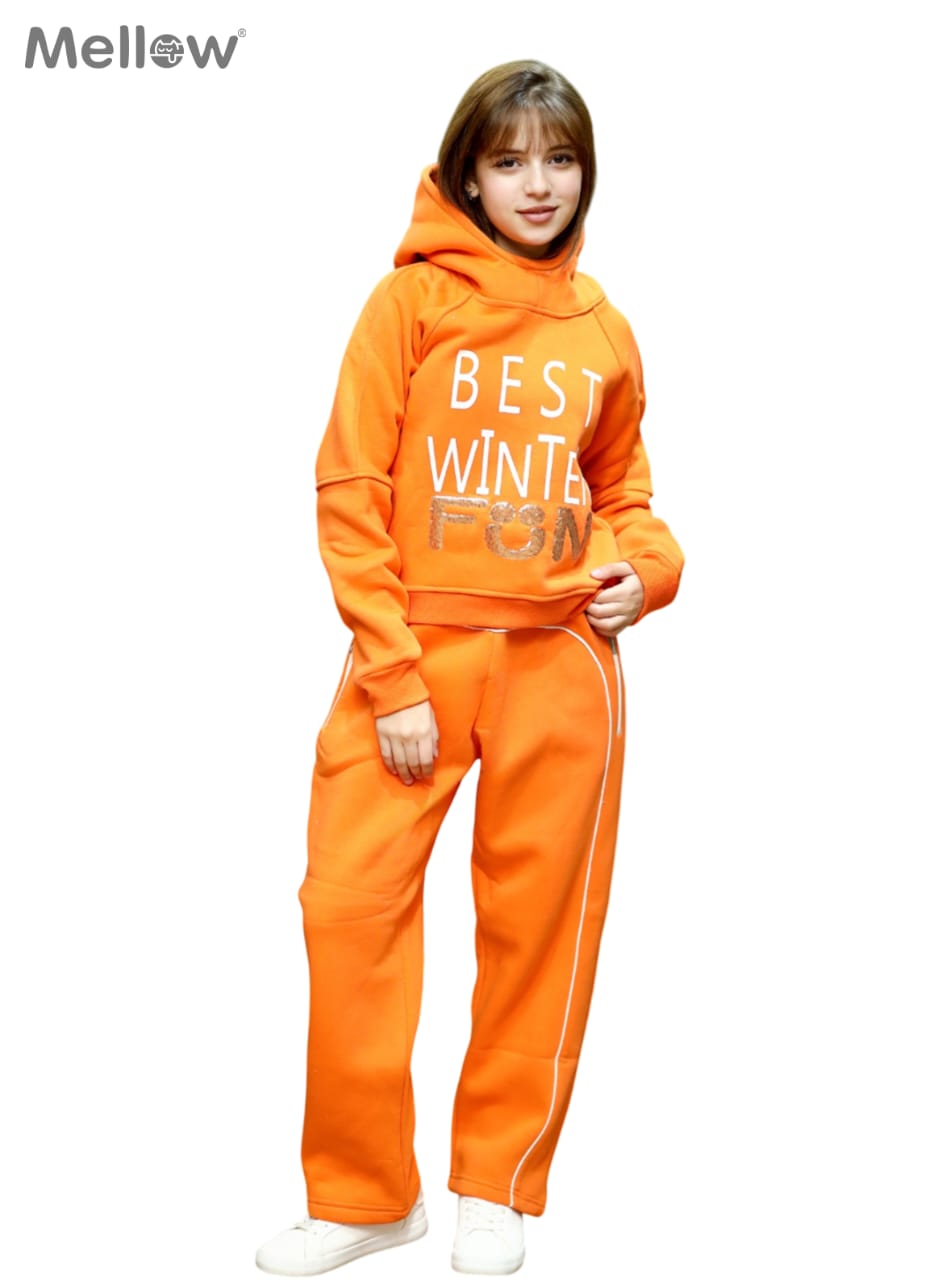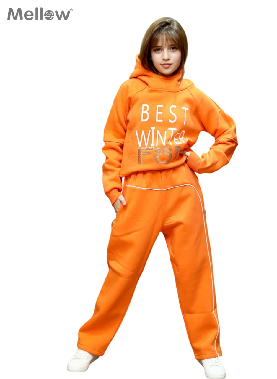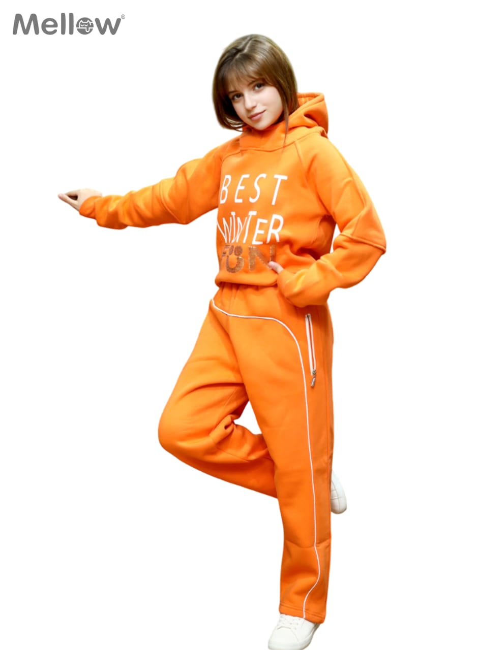 سوت برتقالي زاهي يعكس طاقة الفرح والدفء. يتميز بخامة فاخرة وشعار مميز على الصدر. تصميم مريح وعصري يناسب اللعب اليومي والخروجات الشتوية. مثالي للفتيات ..