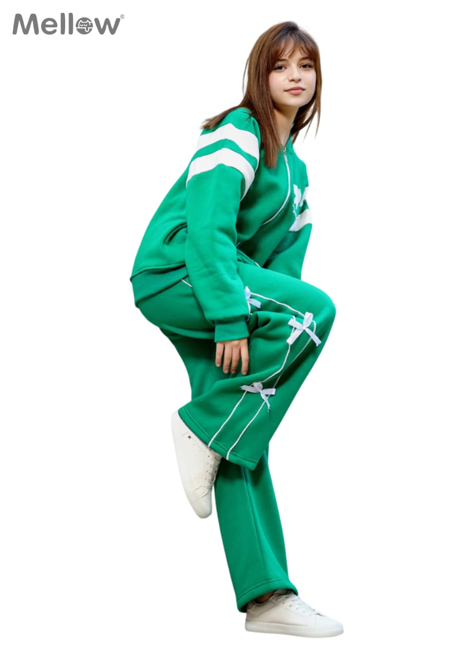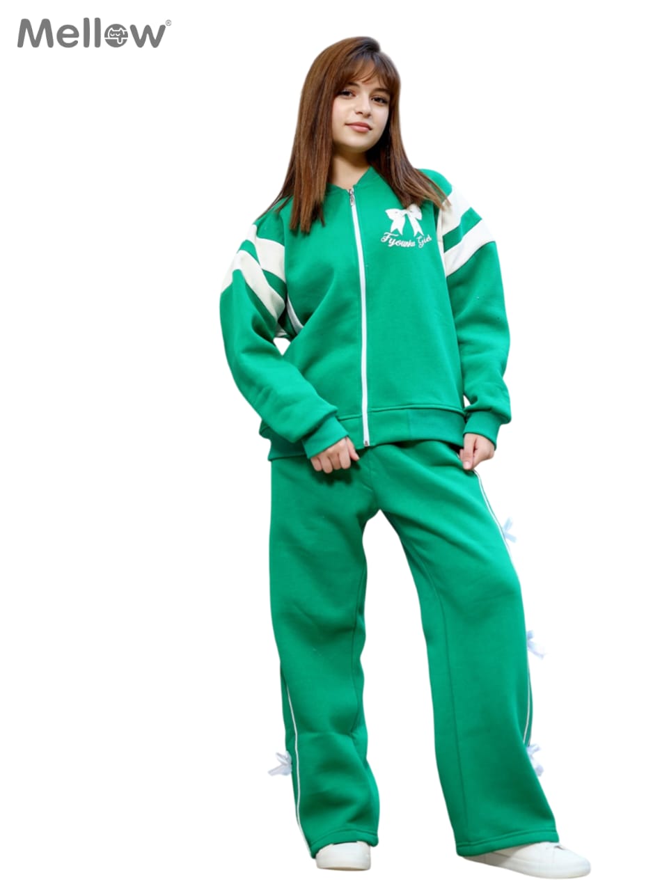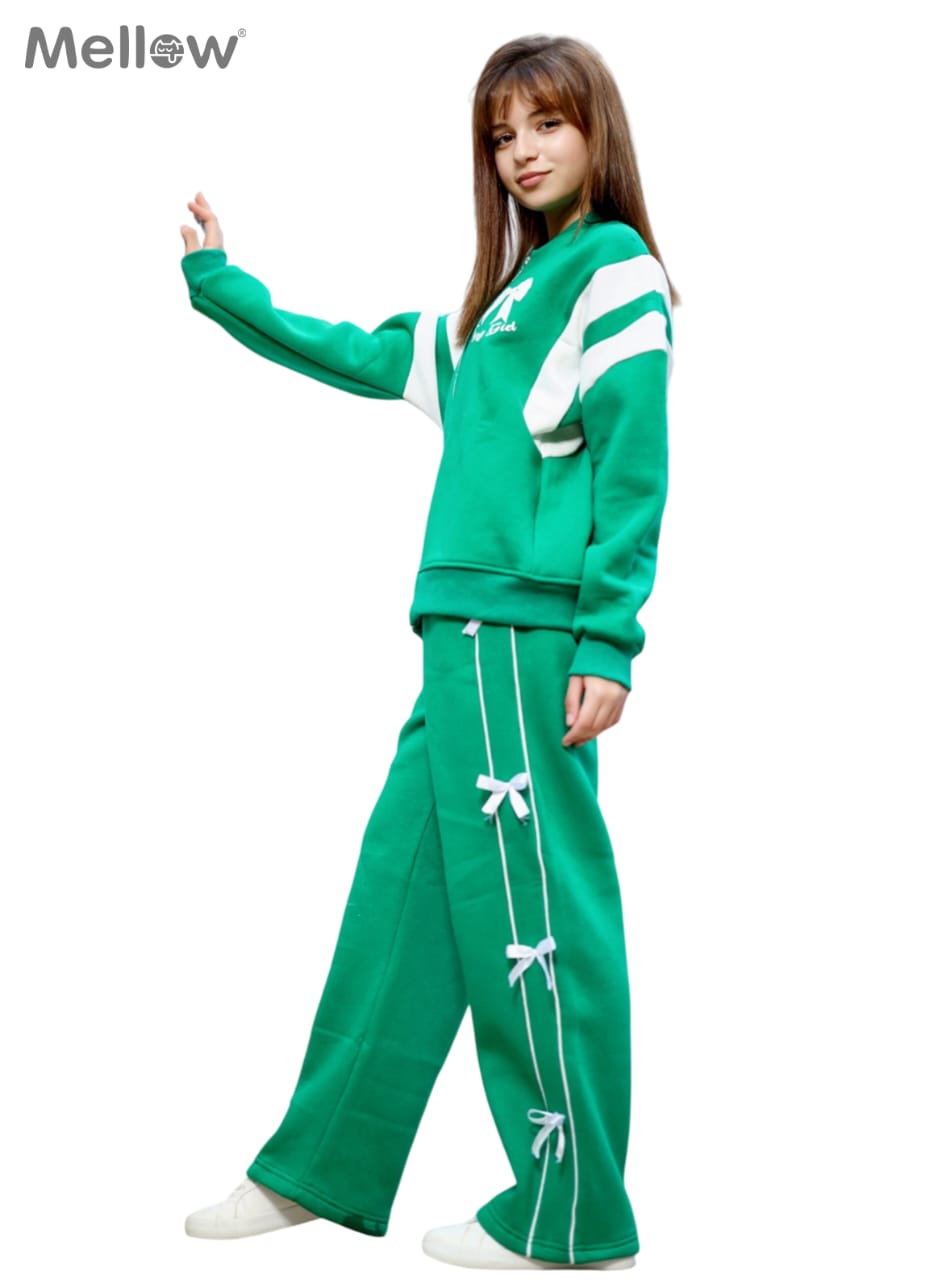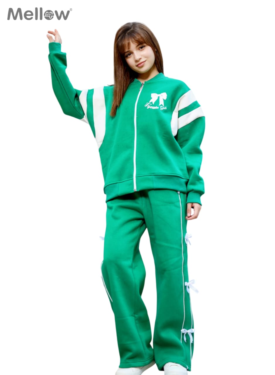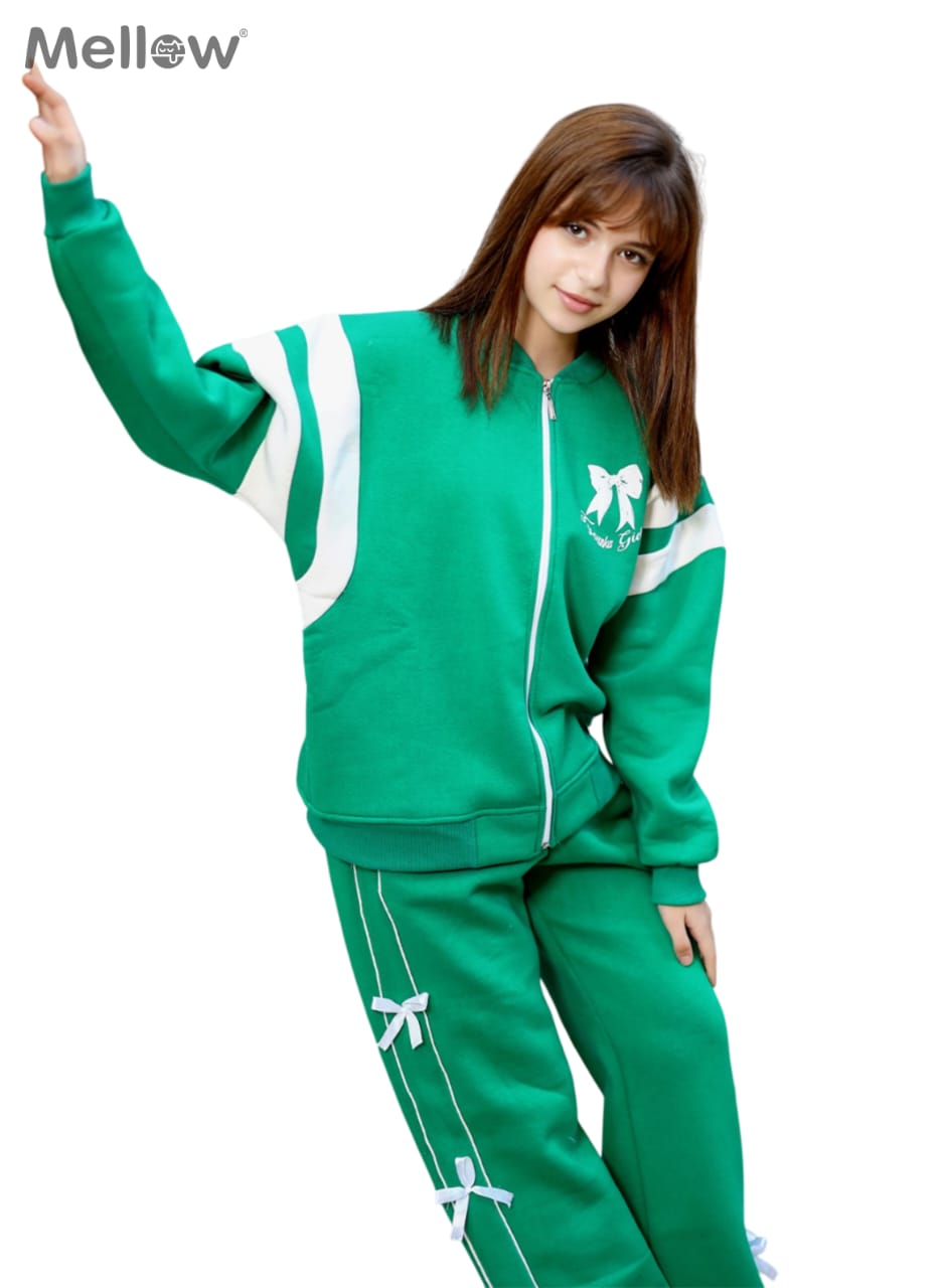 سوت بلون أخضر مميز مع تفاصيل فيونكات جانبية تضيف لمسة ناعمة ولطيفة. تصميم بسوسته أمامي عملي وخامة ناعمة مريحة للارتداء طوال اليوم. مناسب للنزهات الشتوية.