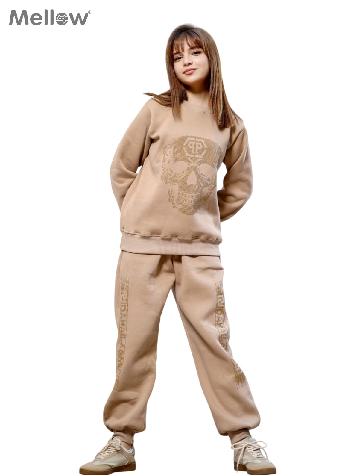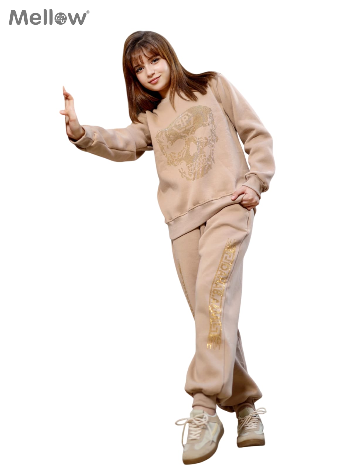 سوت أطفال أنيق بلون بيج فاتح بتفاصيل لامعة بلون ذهبي تضيف لمسة فخامة مميزة.
