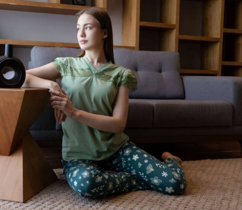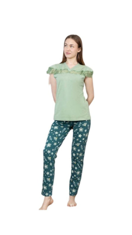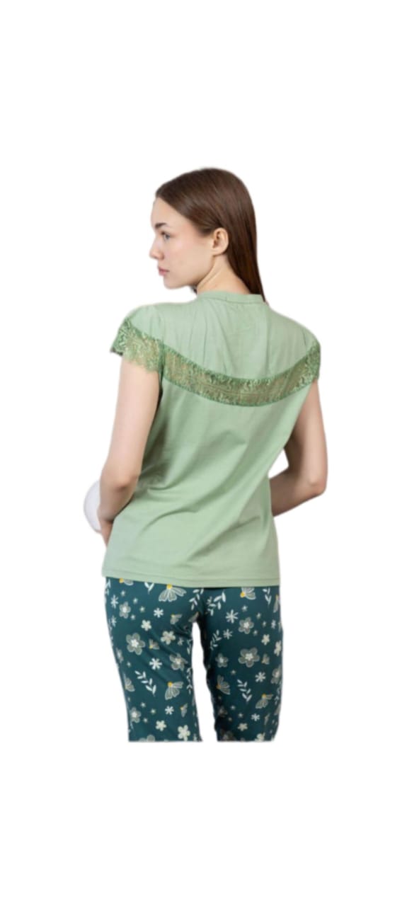 البيجامة تتكون من قميص باللون الأخضر الفاتح مع تفاصيل دانتيل وأكمام قصيرة، و بنطلون باللون الأخضر الداكن مع طبعات زهرية صغيرة التصميم مريح وأنيق، مناسب للنوم والارتداء المنزلي.