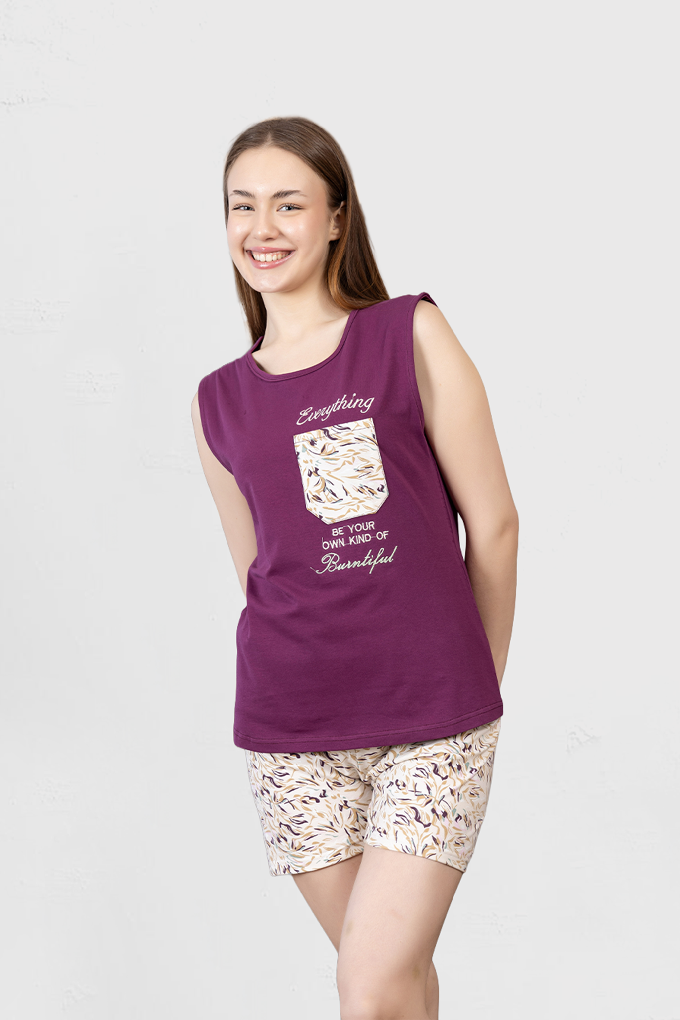 بيجامة منزلية فاخرة مصنوعة من القطن الناعم، تتميز بلونها الداكن الدافئ مع تطريزات زهرية رقيقة على الصدر وحواف الأكمام، وتكتمل بشورت مريح بنقشة زهور متناغمة بألوان هادئة تضفي لمسة أنثوية ساحرة على الإطلالة