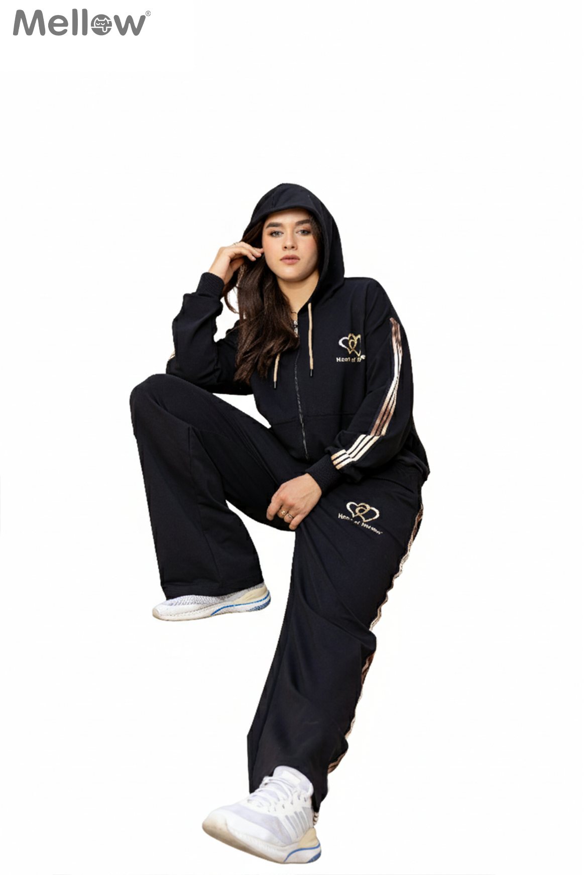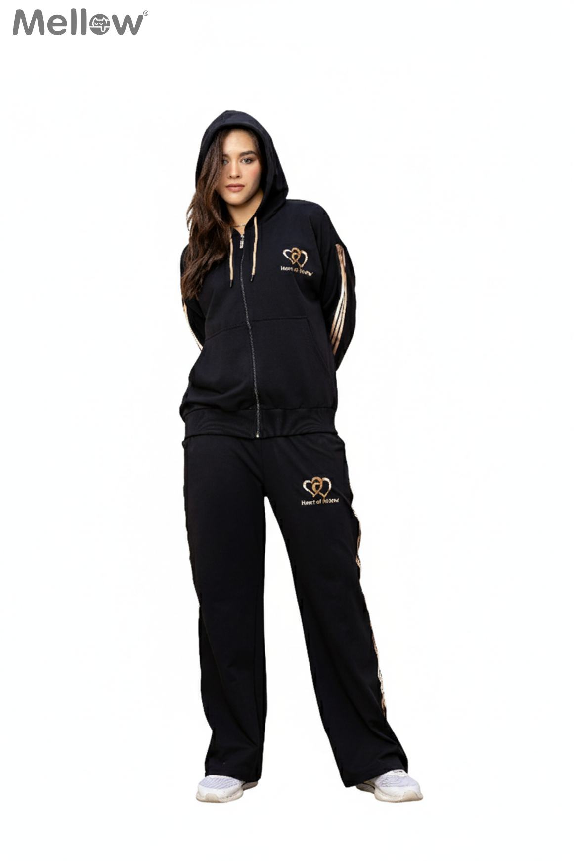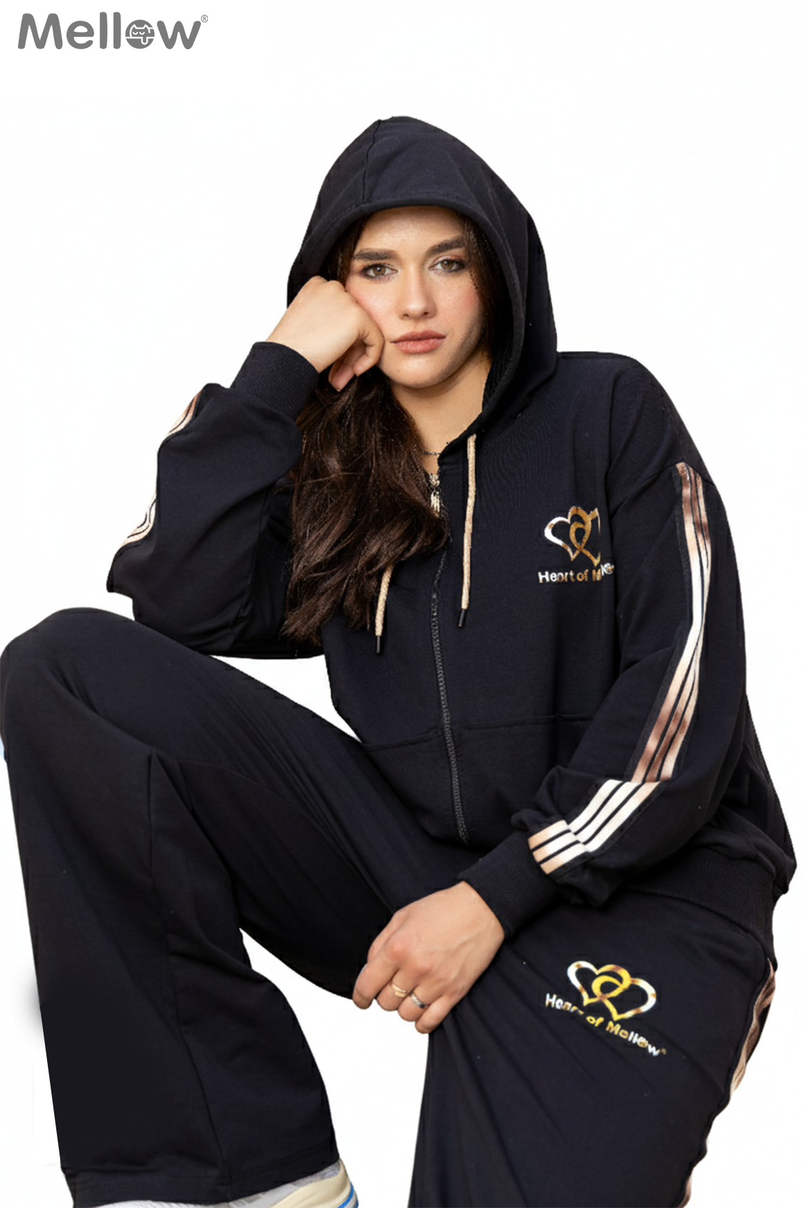 سوت أسود أنيق بشريط تايجر و بغطاء رأس وتطريز ذهبي على الصدر والبنطلون . تصميم يجمع بين الأناقة والراحة بأسلوب عصري مميز.