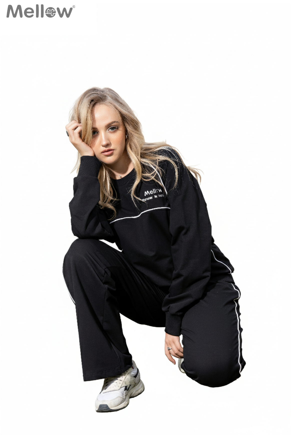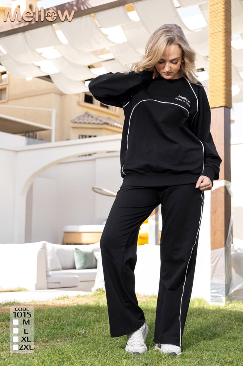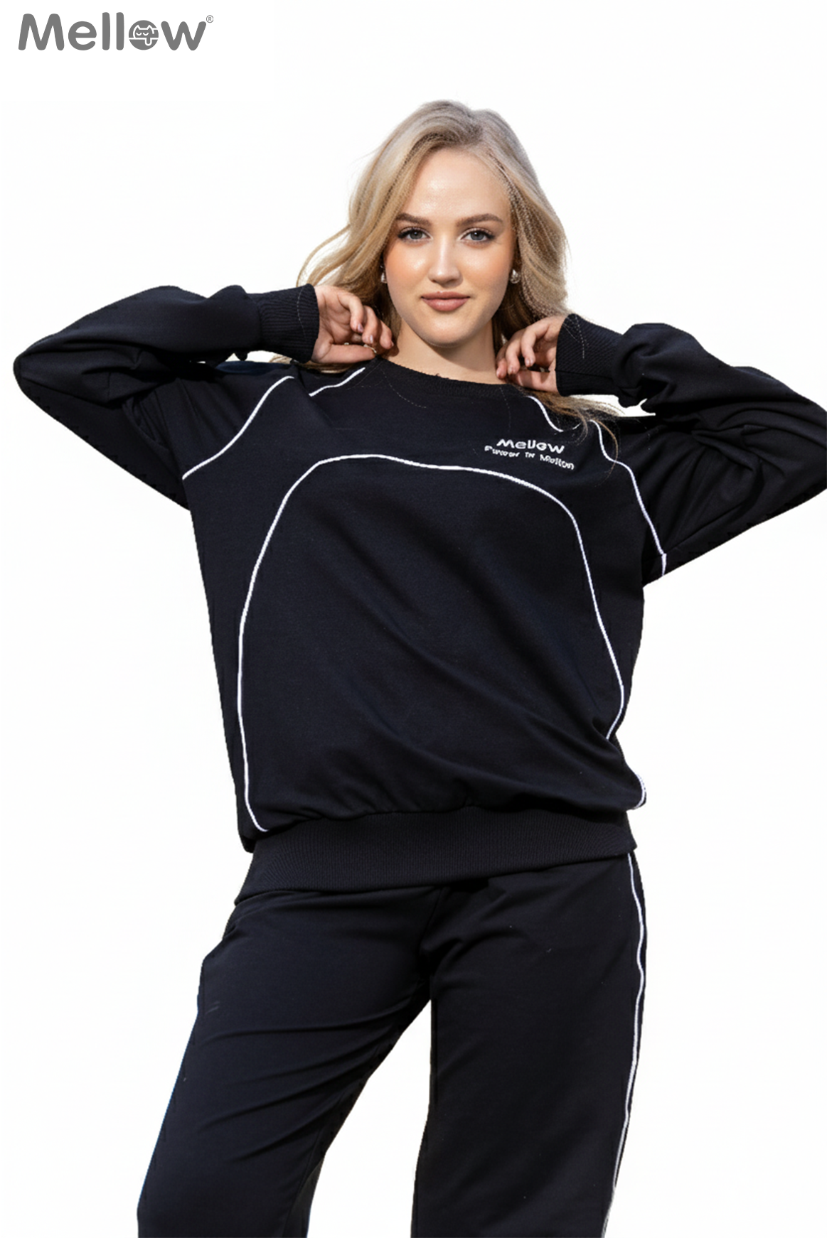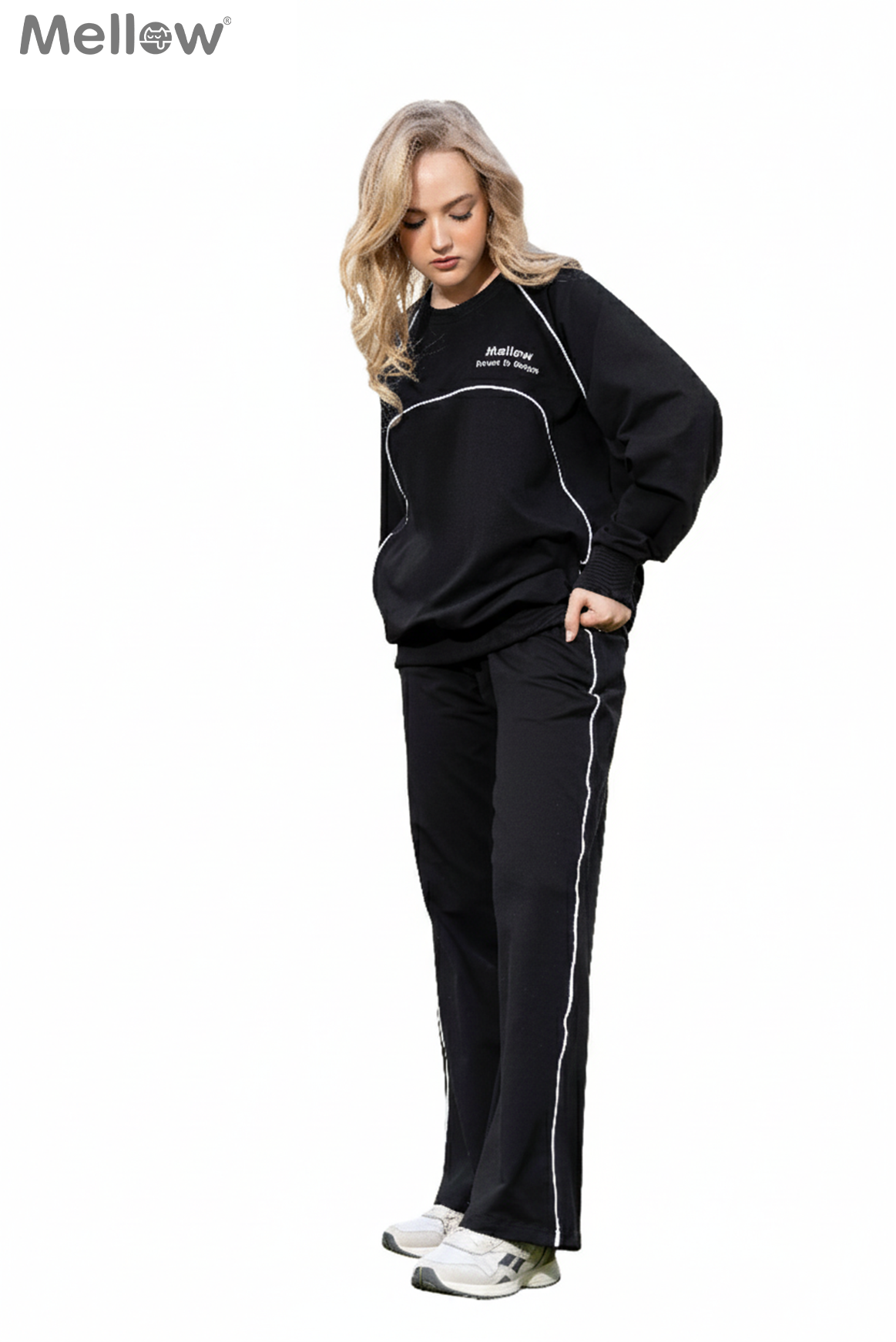 سوت أسود بخطوط بيضاء منحنية تعزز الإطلالة الرياضية بأناقة بسيطة. تصميم عملي ومثالي للخروج أو الراحة.