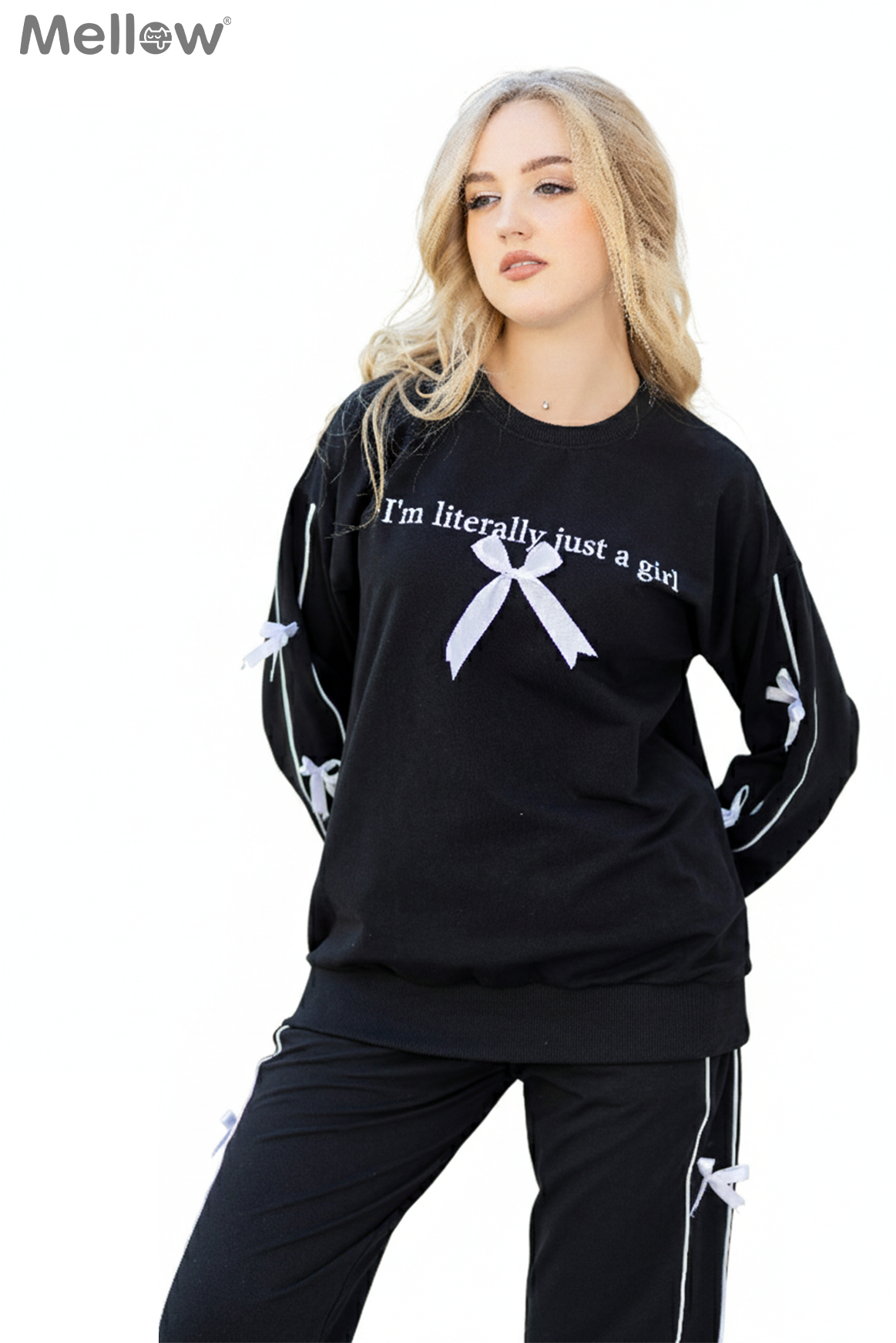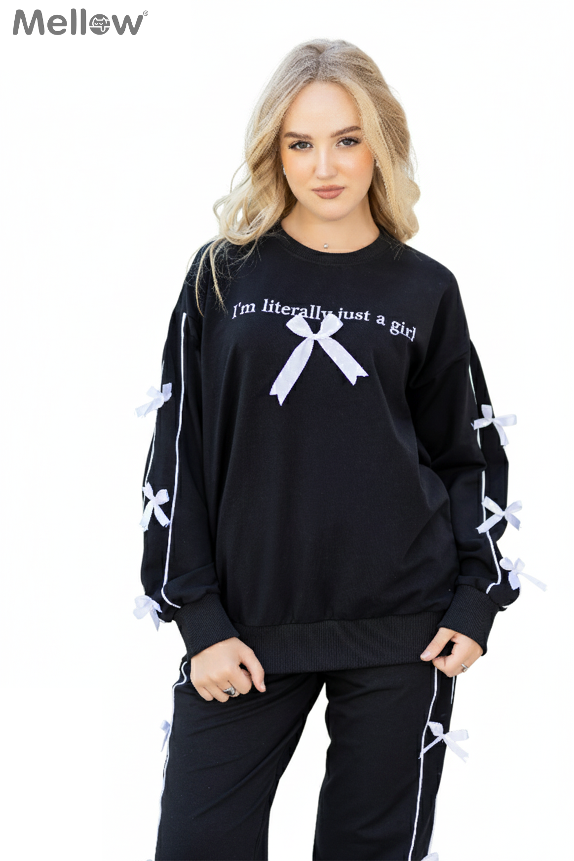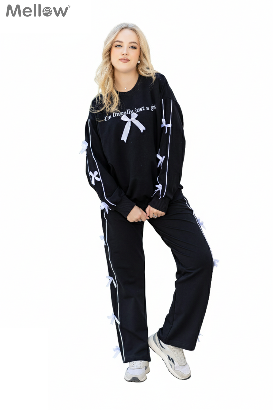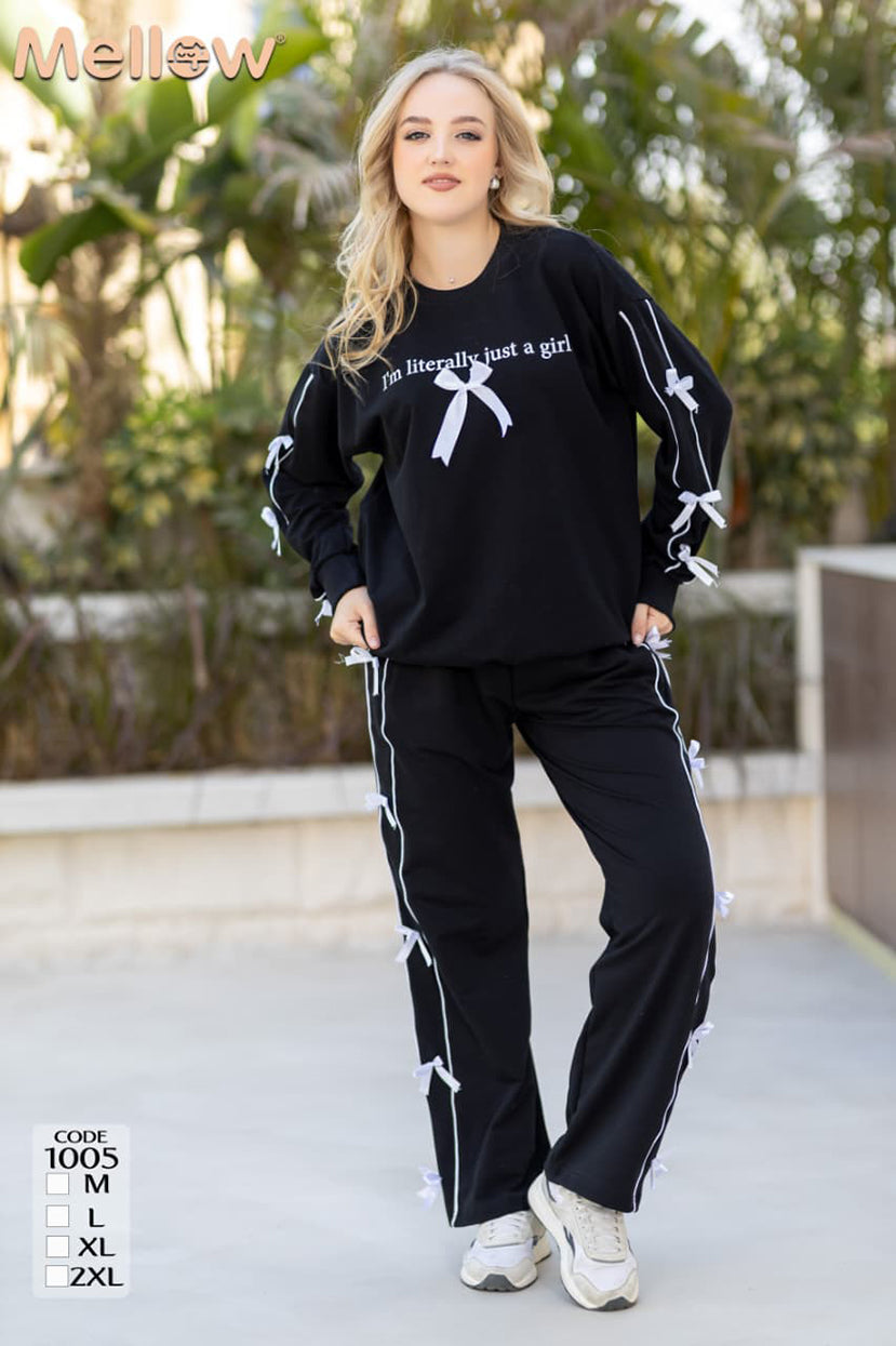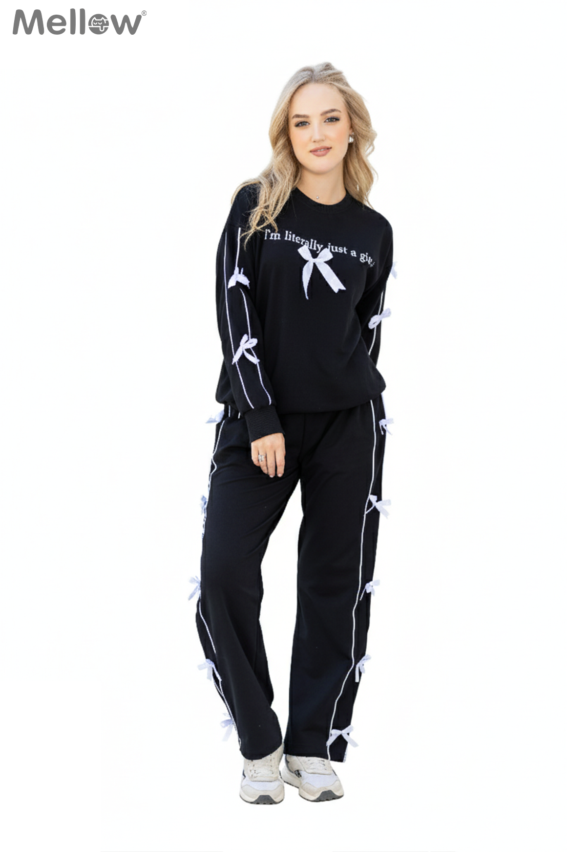 سوت أسود مزين بفيونكات بيضاء تضيف لمسة أنثوية ناعمة. تصميم فريد يمنحك مظهرًا جذابًا ومريحًا في الوقت نفسه.