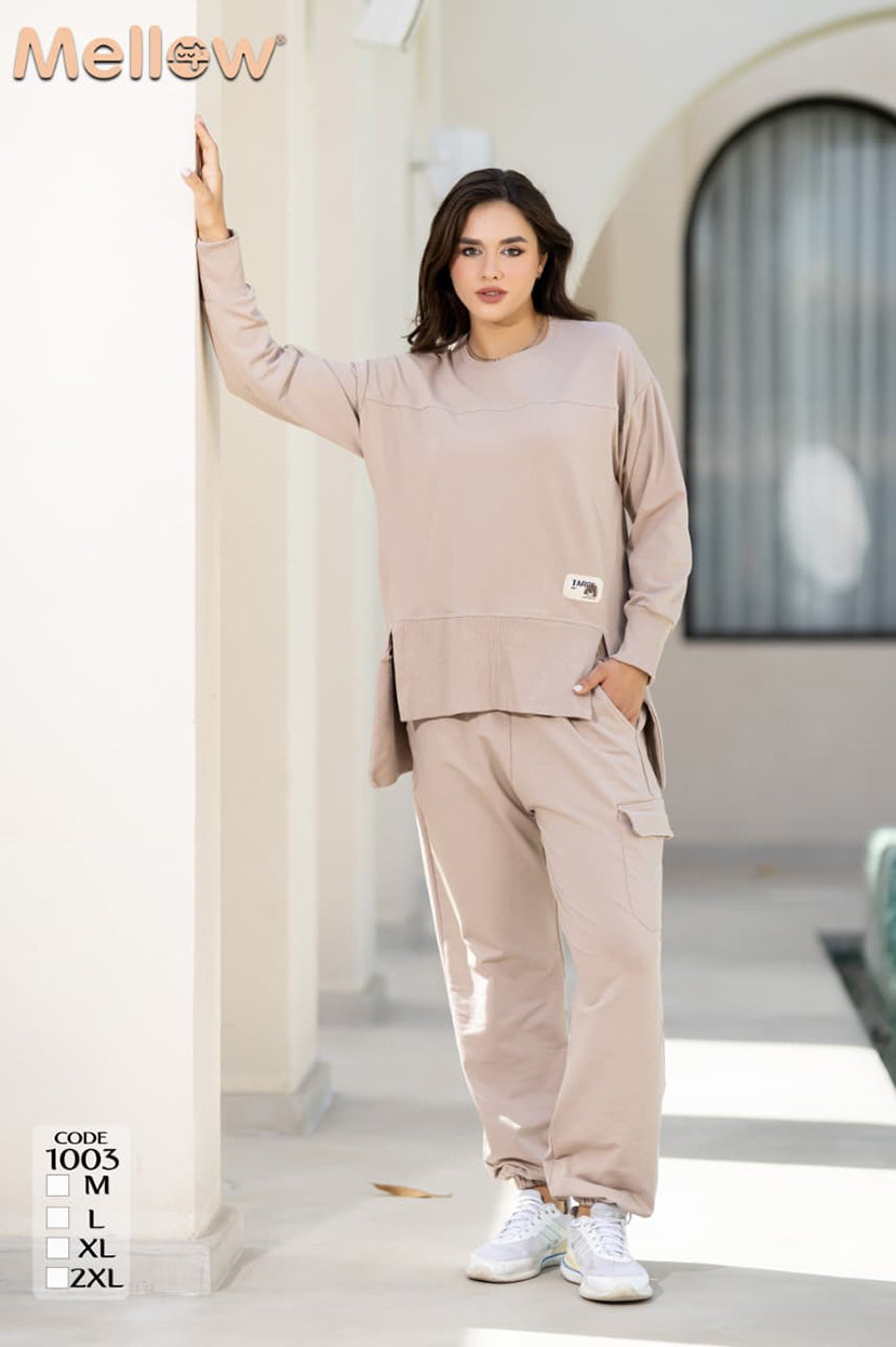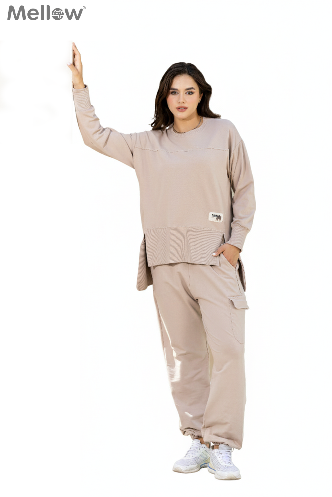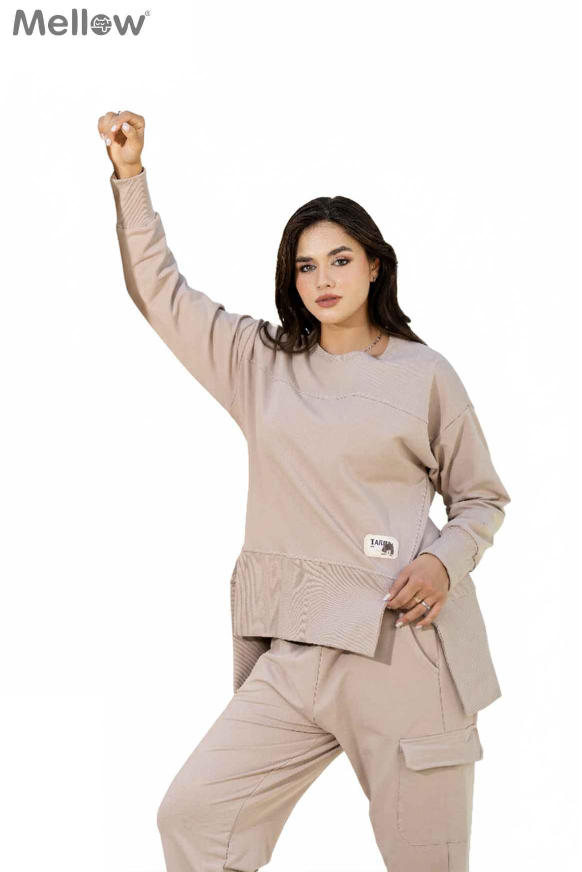 سوت بيج كاجوال بلمسة أنثوية ناعمة، يجمع بين الراحة والأناقة. بلوزة طويلة بأطراف منسوجة و بنطلون واسع بجيوب جانبية.
