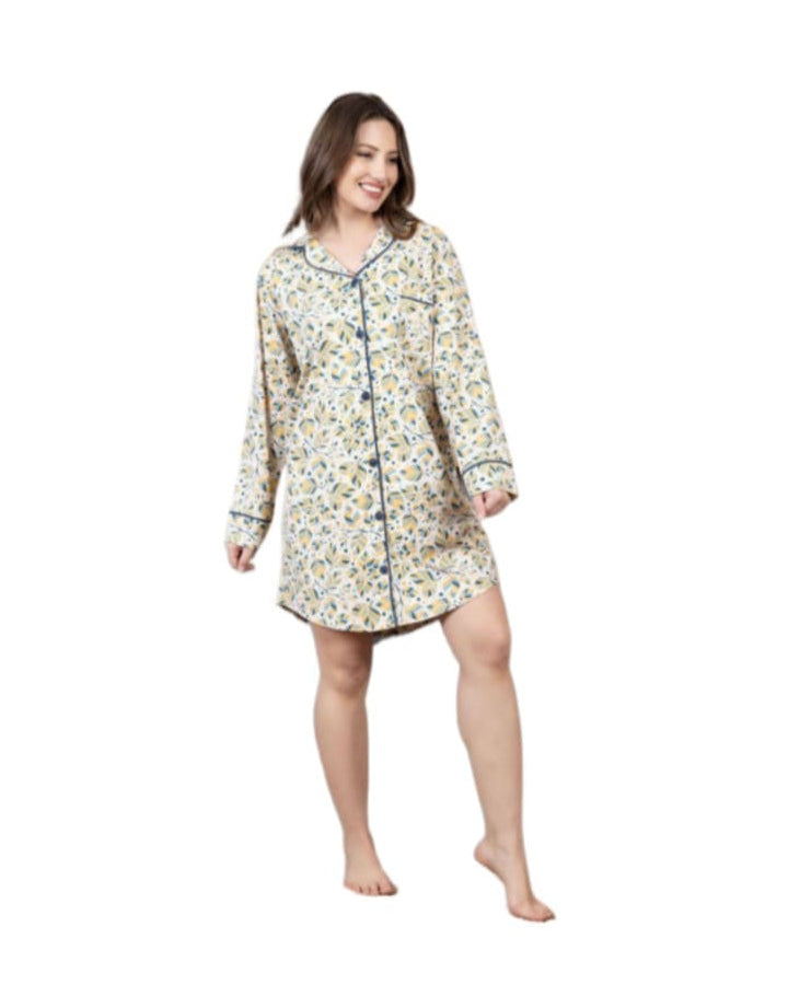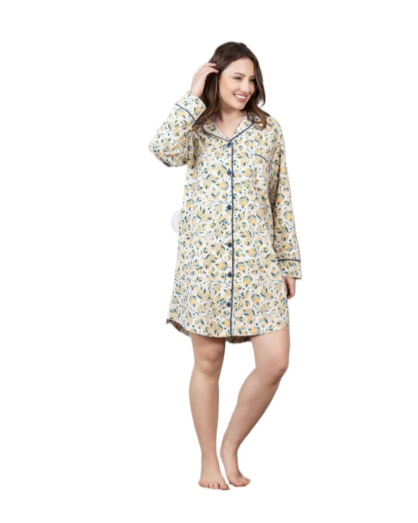 القميص عبارة عن فستان نوم طويل الأكمام بتصميم مريح، مزين بنقشات زهرية صغيرة بلون أصفر فاتح مع تفاصيل زرقاء على الياقة والأزرار. يتميز بقصة فضفاضة تناسب الارتداء اليومي في المنزل