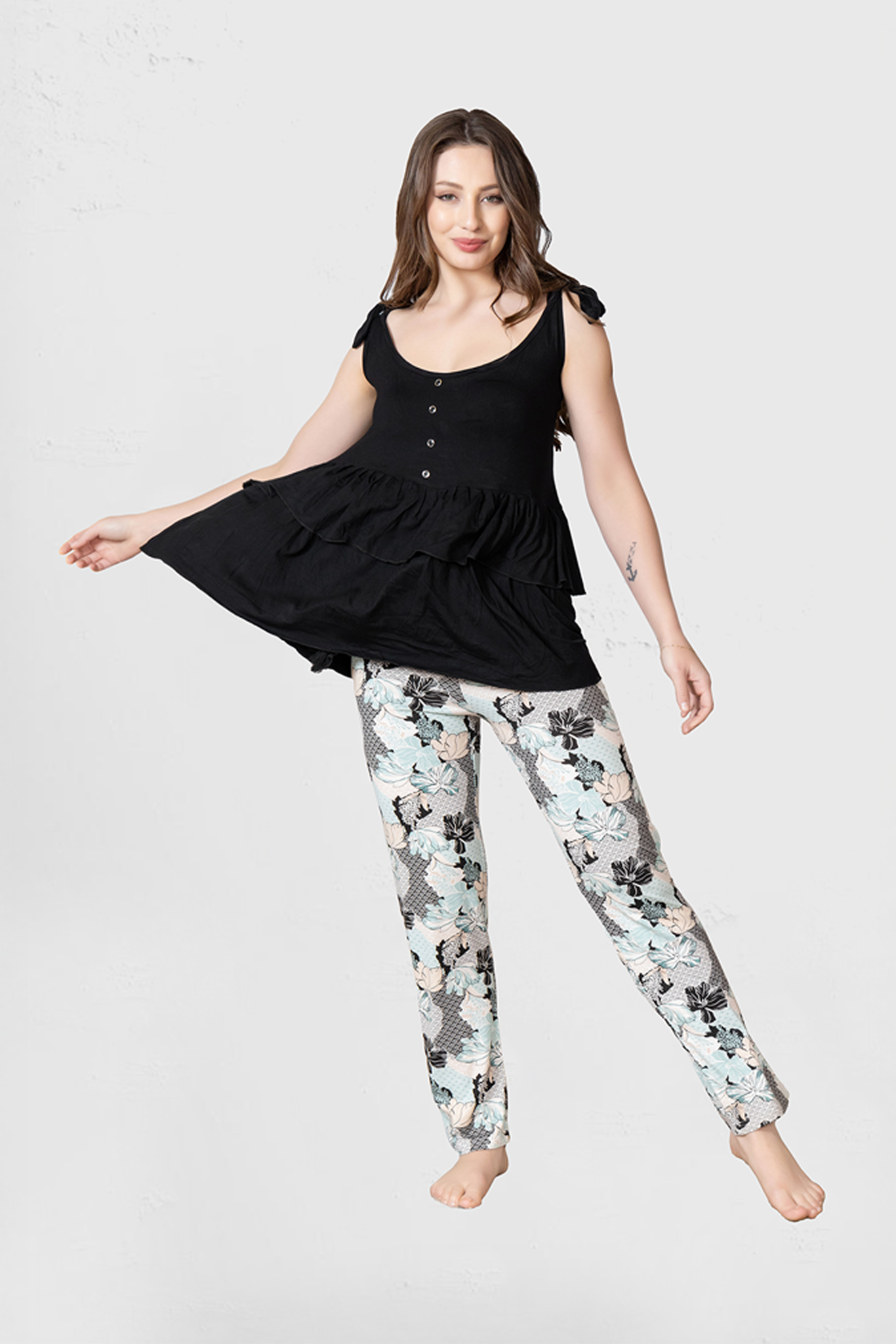 يكتمل الطقم ببنطال بنقشة زهرية ناعمة بألوان فاتحة ومتناسقة، ليمنحك إحساسًا بالانتعاش والجمال داخل المنزل.
