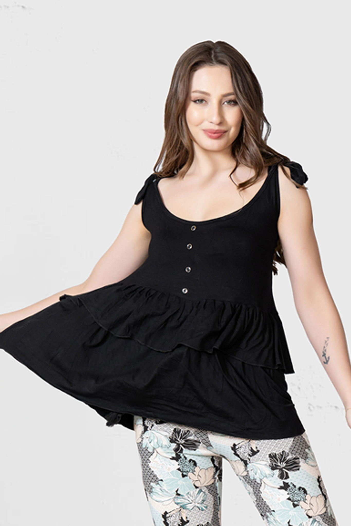 اختاري الأناقة والراحة في آنٍ واحد مع طقم "لمسة نعومة". يأتي التوب بتصميم أنثوي جذّاب بلون أسود أنيق، مزوّد بحمّالات قابلة للربط على الكتفين لإضفاء لمسة ناعمة ومُخصصة. القَصّة الواسعة ذات الطبقات تمنحك إحساسًا بالانسيابية والراحة التامة.