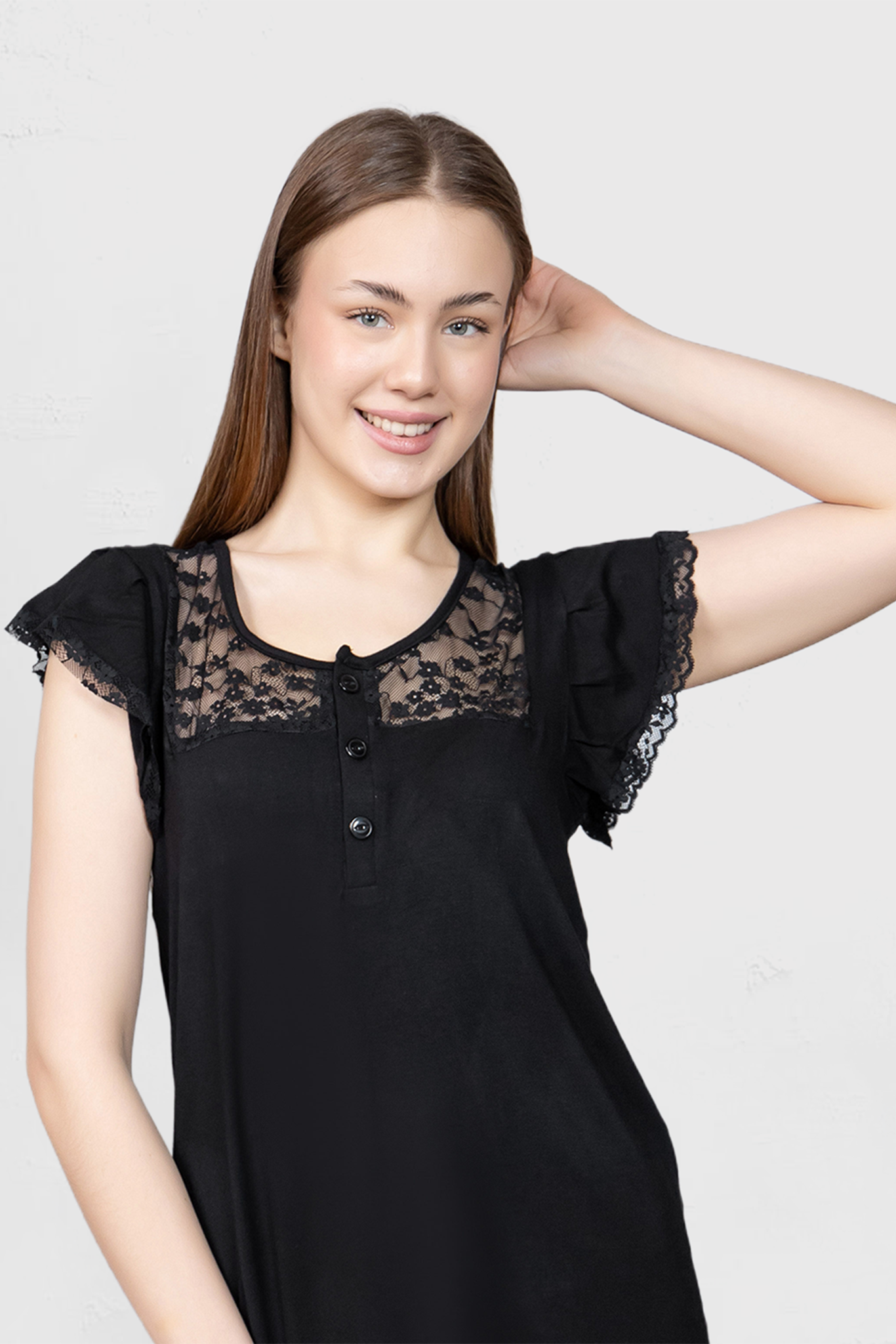 القميص الظاهر في الصورة هو قميص نوم نسائي قصير باللون الأسود. يتميز بتصميم بسيط وأنيق مع أكمام قصيرة مزينة بالدانتيل، كما يوجد دانتيل أيضاً عند فتحة الصدر وحافة القميص السفلية. القماش يبدو ناعماً وخفيفاً، مما يجعله مناسباً للاستخدام كملابس نوم مريحة