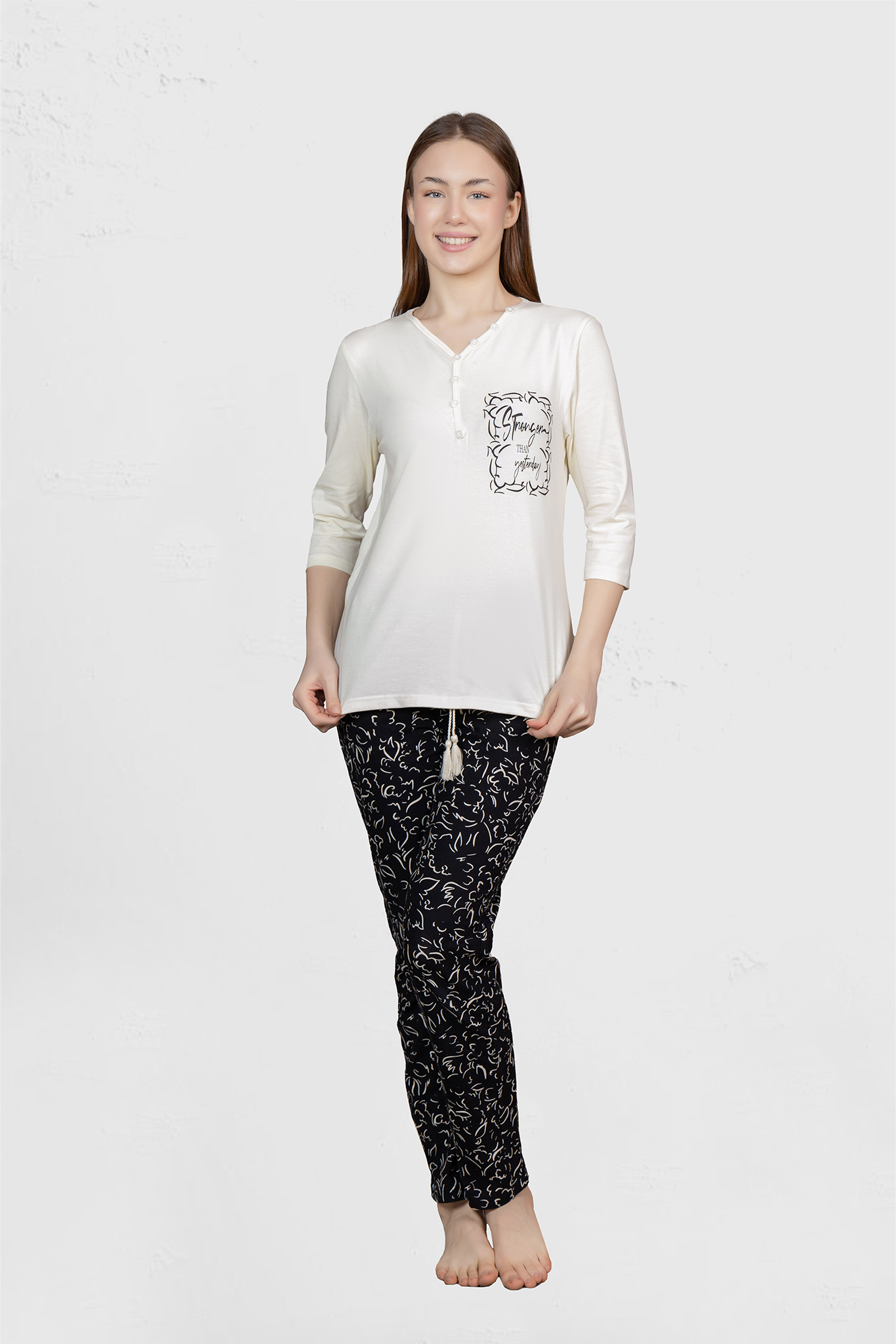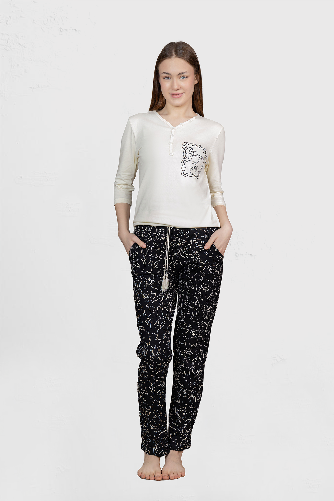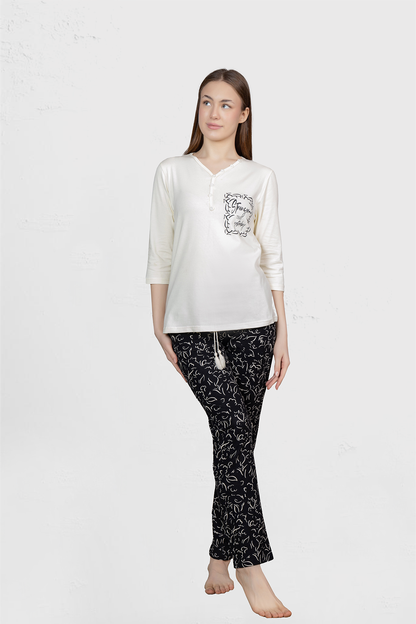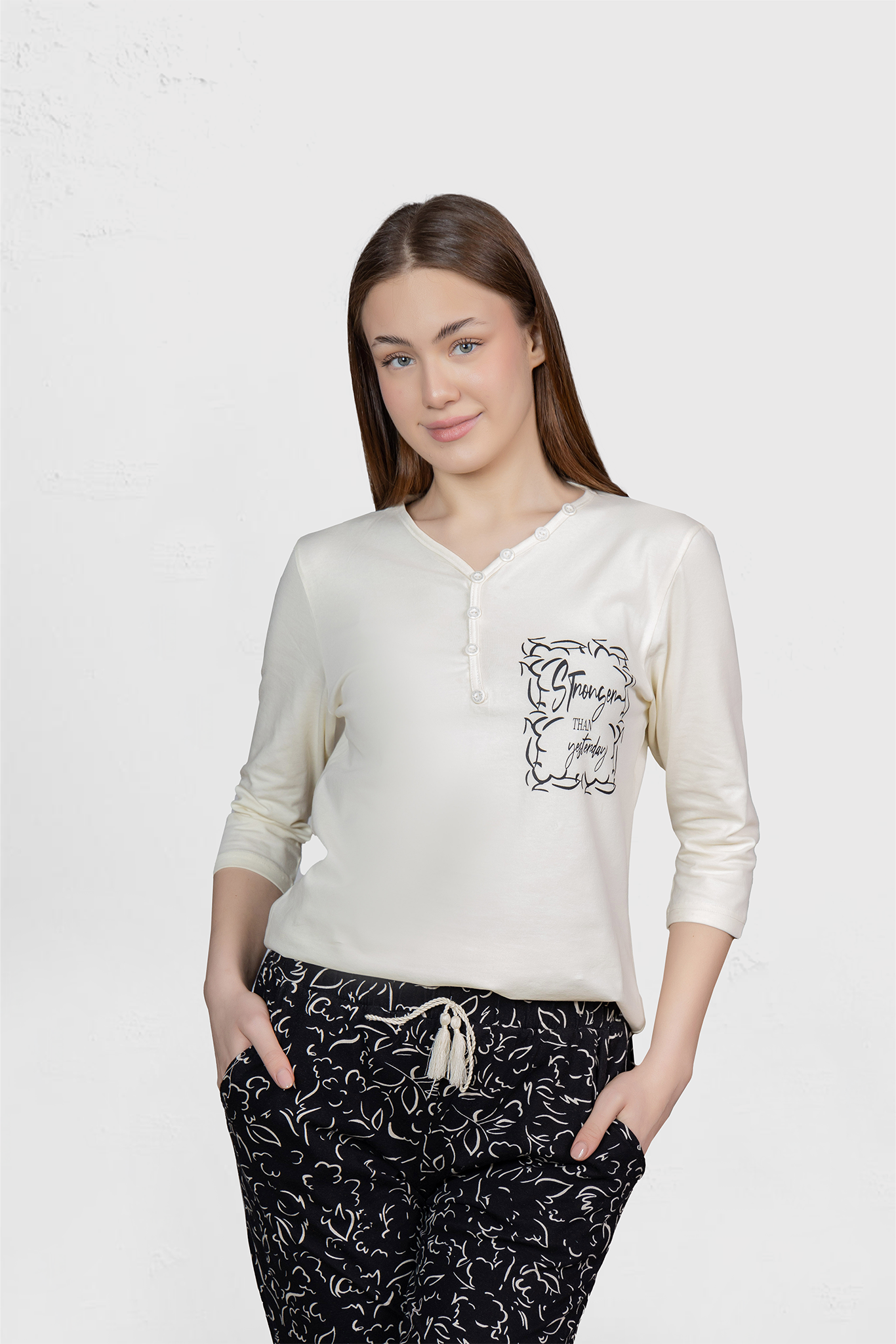 ستمتعي بالراحة والأناقة مع طقم لمسة الأنوثة، المصمم ليجمع بين البساطة والجاذبية. يتكون من بلوزة بيج بأكمام ثلاثة أرباع مع تفاصيل أزرار رقيقة ونقشة فنية تضيف لمسة أنثوية ناعمة. أما البنطلون فهو بلون أسود مع نقوش أنيقة وحزام خصر بحبل عصري ليوفر لك إحساسًا بالفخامة والراحة في آنٍ واحد.